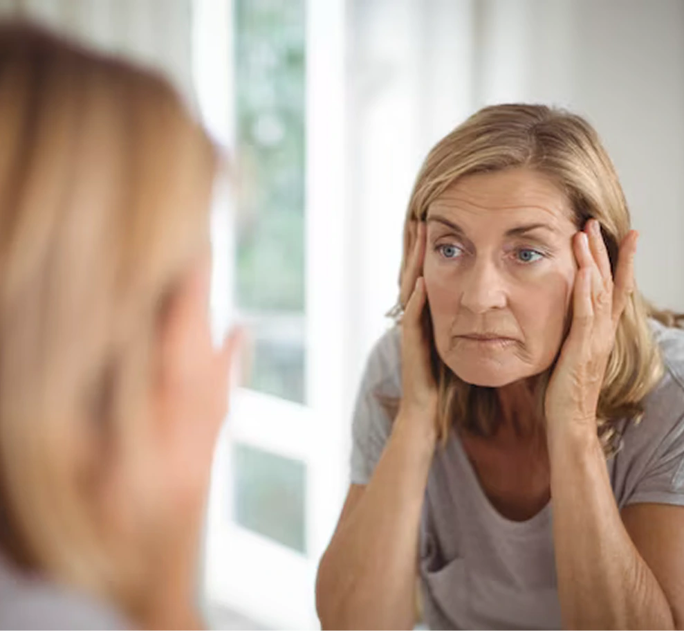 Hair thinning, brittle nails, and visible aging signs.